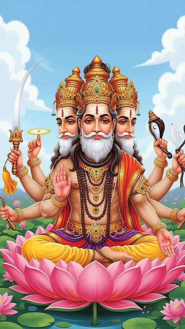 Brahma is the first member of the Trimurti, the divine trinity of supreme gods. He is revered as the creator of the universe and all life within it. He is often depicted with four heads, representing the four Vedas (sacred texts) and his omnidirectional knowledge, and four arms. Unlike the other major gods, Vishnu and Shiva, Brahma is not widely worshipped in contemporary practice. There are very few temples dedicated to him, with the most famous one located in Pushkar, India. His role is primarily that of the cosmic architect who brings the universe into being.
