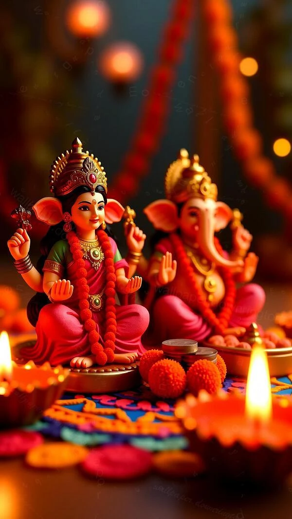Diwali God wallpapers focus on the spiritual and devotional aspect of the Festival of Lights. These wallpapers feature Hindu deities commonly worshipped during Diwali, such as Goddess Lakshmi and Lord Ganesha, symbolizing prosperity, wealth, wisdom, and new beginnings. The designs include traditional religious art, digital illustrations, and festive divine imagery, making them ideal for mobile phones, lock screens, and desktop backgrounds during the Diwali celebration.