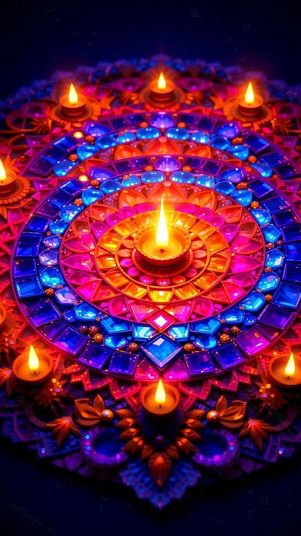Diwali Rangoli wallpapers showcase colorful and artistic floor designs traditionally created during the Diwali festival. Rangoli patterns are made using vibrant colors, flowers, and geometric shapes to welcome positivity, prosperity, and good fortune into homes. These wallpapers capture the beauty of traditional Indian art, making them perfect for mobile phones, lock screens, and desktop backgrounds during the festival of lights.