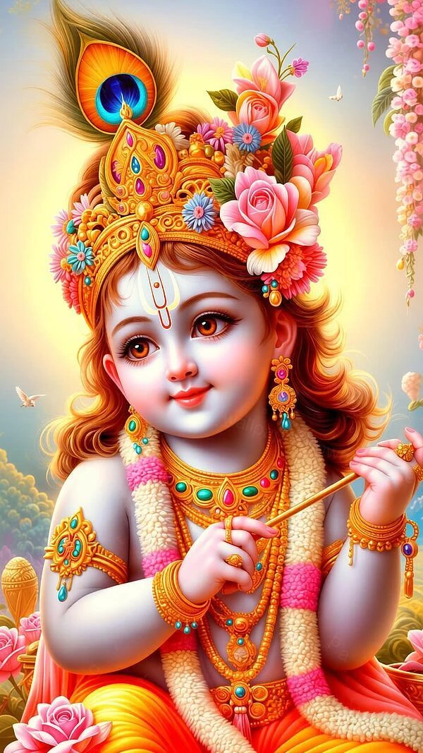 Lord Krishna, the charming and divine incarnation of Vishnu, is one of the most beloved deities in Hinduism. Known as the dark-skinned flute player (Muralidhar), butter thief (Makhan Chor), and eternal lover of Radha, he embodies love, wisdom, and divine play (lila). Born in Mathura and raised in Vrindavan, Krishna is celebrated for his childhood mischief, the enchanting Ras Leela dance with the gopis, and his profound teachings in the Bhagavad Gita as Arjuna's charioteer. Adorned with a peacock feather crown, yellow dhoti, and garlands, he is worshipped as the supreme protector and compassionate guide. Millions chant "Hare Krishna" and celebrate his birth during Janmashtami with devotion and joy.