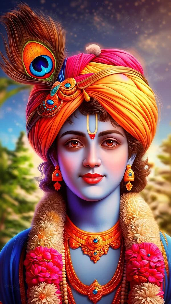 Lord Krishna, the charming and divine incarnation of Vishnu, is one of the most beloved deities in Hinduism. Known as the dark-skinned flute player (Muralidhar), butter thief (Makhan Chor), and eternal lover of Radha, he embodies love, wisdom, and divine play (lila). Born in Mathura and raised in Vrindavan, Krishna is celebrated for his childhood mischief, the enchanting Ras Leela dance with the gopis, and his profound teachings in the Bhagavad Gita as Arjuna's charioteer. Adorned with a peacock feather crown, yellow dhoti, and garlands, he is worshipped as the supreme protector and compassionate guide. Millions chant "Hare Krishna" and celebrate his birth during Janmashtami with devotion and joy.