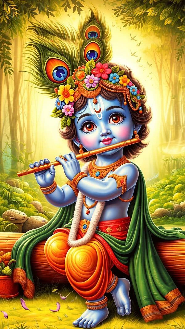 Lord Krishna, the charming and divine incarnation of Vishnu, is one of the most beloved deities in Hinduism. Known as the dark-skinned flute player (Muralidhar), butter thief (Makhan Chor), and eternal lover of Radha, he embodies love, wisdom, and divine play (lila). Born in Mathura and raised in Vrindavan, Krishna is celebrated for his childhood mischief, the enchanting Ras Leela dance with the gopis, and his profound teachings in the Bhagavad Gita as Arjuna's charioteer. Adorned with a peacock feather crown, yellow dhoti, and garlands, he is worshipped as the supreme protector and compassionate guide. Millions chant "Hare Krishna" and celebrate his birth during Janmashtami with devotion and joy.