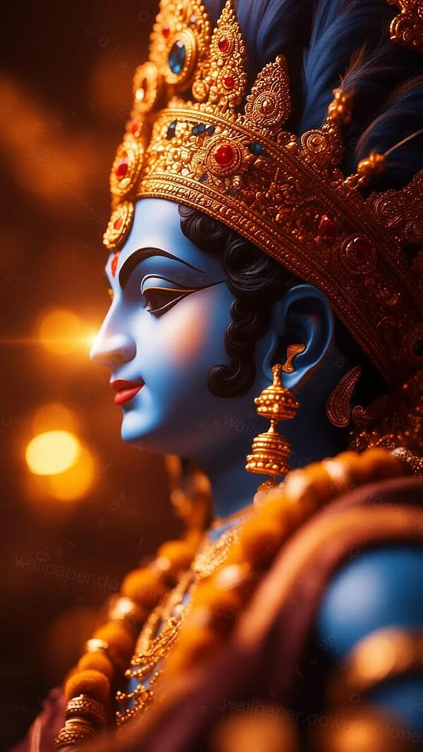 Lord Krishna, the charming and divine incarnation of Vishnu, is one of the most beloved deities in Hinduism. Known as the dark-skinned flute player (Muralidhar), butter thief (Makhan Chor), and eternal lover of Radha, he embodies love, wisdom, and divine play (lila). Born in Mathura and raised in Vrindavan, Krishna is celebrated for his childhood mischief, the enchanting Ras Leela dance with the gopis, and his profound teachings in the Bhagavad Gita as Arjuna's charioteer. Adorned with a peacock feather crown, yellow dhoti, and garlands, he is worshipped as the supreme protector and compassionate guide. Millions chant "Hare Krishna" and celebrate his birth during Janmashtami with devotion and joy.
