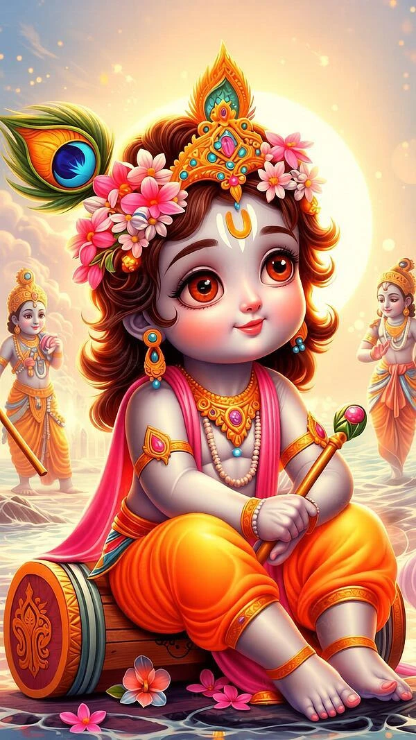 Lord Krishna, the charming and divine incarnation of Vishnu, is one of the most beloved deities in Hinduism. Known as the dark-skinned flute player (Muralidhar), butter thief (Makhan Chor), and eternal lover of Radha, he embodies love, wisdom, and divine play (lila). Born in Mathura and raised in Vrindavan, Krishna is celebrated for his childhood mischief, the enchanting Ras Leela dance with the gopis, and his profound teachings in the Bhagavad Gita as Arjuna's charioteer. Adorned with a peacock feather crown, yellow dhoti, and garlands, he is worshipped as the supreme protector and compassionate guide. Millions chant "Hare Krishna" and celebrate his birth during Janmashtami with devotion and joy.