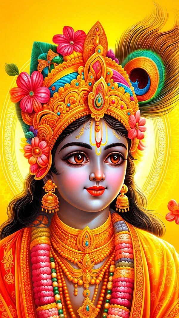 Lord Krishna, the charming and divine incarnation of Vishnu, is one of the most beloved deities in Hinduism. Known as the dark-skinned flute player (Muralidhar), butter thief (Makhan Chor), and eternal lover of Radha, he embodies love, wisdom, and divine play (lila). Born in Mathura and raised in Vrindavan, Krishna is celebrated for his childhood mischief, the enchanting Ras Leela dance with the gopis, and his profound teachings in the Bhagavad Gita as Arjuna's charioteer. Adorned with a peacock feather crown, yellow dhoti, and garlands, he is worshipped as the supreme protector and compassionate guide. Millions chant "Hare Krishna" and celebrate his birth during Janmashtami with devotion and joy.