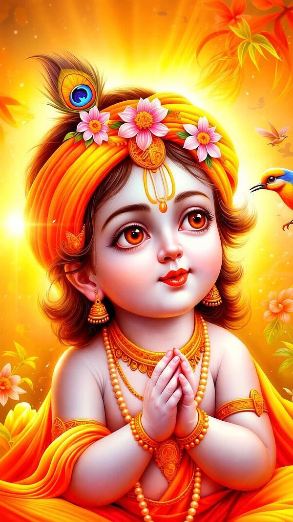 Lord Krishna, the charming and divine incarnation of Vishnu, is one of the most beloved deities in Hinduism. Known as the dark-skinned flute player (Muralidhar), butter thief (Makhan Chor), and eternal lover of Radha, he embodies love, wisdom, and divine play (lila). Born in Mathura and raised in Vrindavan, Krishna is celebrated for his childhood mischief, the enchanting Ras Leela dance with the gopis, and his profound teachings in the Bhagavad Gita as Arjuna's charioteer. Adorned with a peacock feather crown, yellow dhoti, and garlands, he is worshipped as the supreme protector and compassionate guide. Millions chant "Hare Krishna" and celebrate his birth during Janmashtami with devotion and joy.