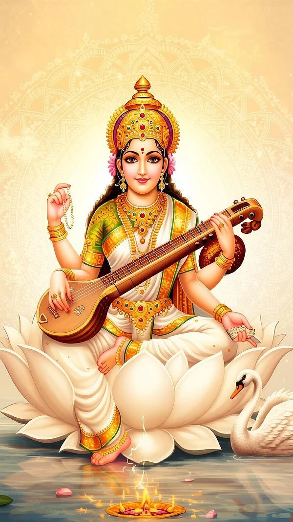 Goddess Saraswati is the Hindu deity of knowledge, music, arts, speech, wisdom, and learning. Radiant in pure white attire symbolizing purity, she sits on a white lotus or rides a swan (hamsa). Her four arms hold a veena (musical instrument), a book (Vedas), a rosary (japa mala), and a water pot. As the divine consort of Brahma and the flowing river of consciousness, she bestows intelligence, creativity, and eloquence. Worshipped especially during Vasant Panchami and by students before exams, she is revered with the mantra "Om Aim Saraswatyai Namaha" as the eternal source of inspiration and the remover of ignorance.